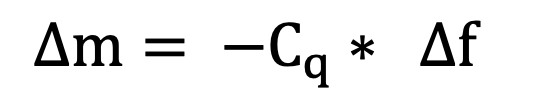 ∆m和∆f分别为质量变化和频率位移,Cq为厚度传感器的质量灵敏度常数。在由AT切割纯石英材料得到的传感器中,6MHz的石英晶体的Cq的值约为15ng/(cm-2*Hz)。但此方程只有在晶体表面增加的薄层质量较小时,是精确的。