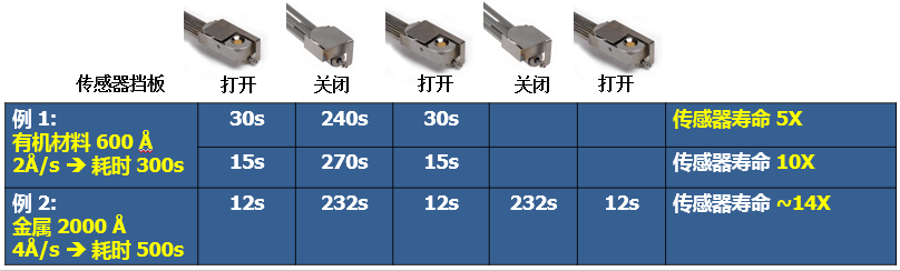 在IM模式下,QCM传感器和PID控制只需要很短的一段时间来捕捉正确的沉积速率值。这意味着,一个或多个选定的QCM传感器的挡板将在一段预先设定的时间内关闭,并在另一段预先设定的时间内反复打开,仅用于测量速率。关闭/开启的比值设置较高时,可以延长传感器的使用寿命,一般可以延长5到30倍。在IM模式下,要求整个过程处于完全的PID控制模式。