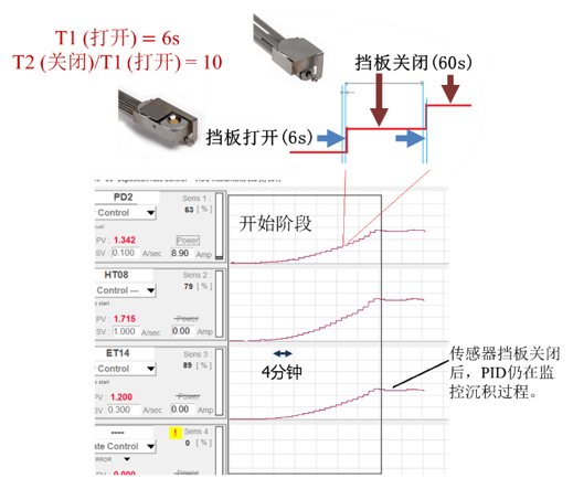 下图显示了传感器挡板开启6秒,然后关闭60秒(开/闭比设置为10)时材料蒸发速率的变化。如图所示,每个时间间隔为4分钟。挡板的开启/关闭过程由PID自动控制。IM过程可以在启动阶段和蒸发过程中打开。在挡板关闭期间,如果沉积速率是稳定的,则持续监测沉积速率和薄膜厚度。建议用户将传感器挡板开启时间延长至少12秒,可关闭快门120秒(开/闭比为10)。它将提供更可靠的沉积速率。在这种情况下,开/闭比设置为10,意味着传感器寿命可以增加10倍。