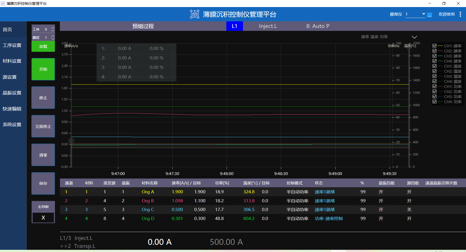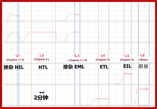 在设定PID参数,我们将掺杂HIL(organic1 + organic2)定义为第1层,HTL(organic2)定义为第2层,EML(organic3 + organic4)定义为第3层,ETL(organic5)定义为第4层,EIL(organic6)定义为第5层,Cathode(Metal)定义为第6层。也就是说,organic 1+2 和 3+4材料是同时沉积的共沉积过程。第6层被定义为最后一层。1-5层的启动和PID控制可以交替调整,以加快沉积过程。主挡板的开启/关闭可设置为手动或自动模式。对于第6层沉积(金属是Al),可以看到熔化过程的影响。